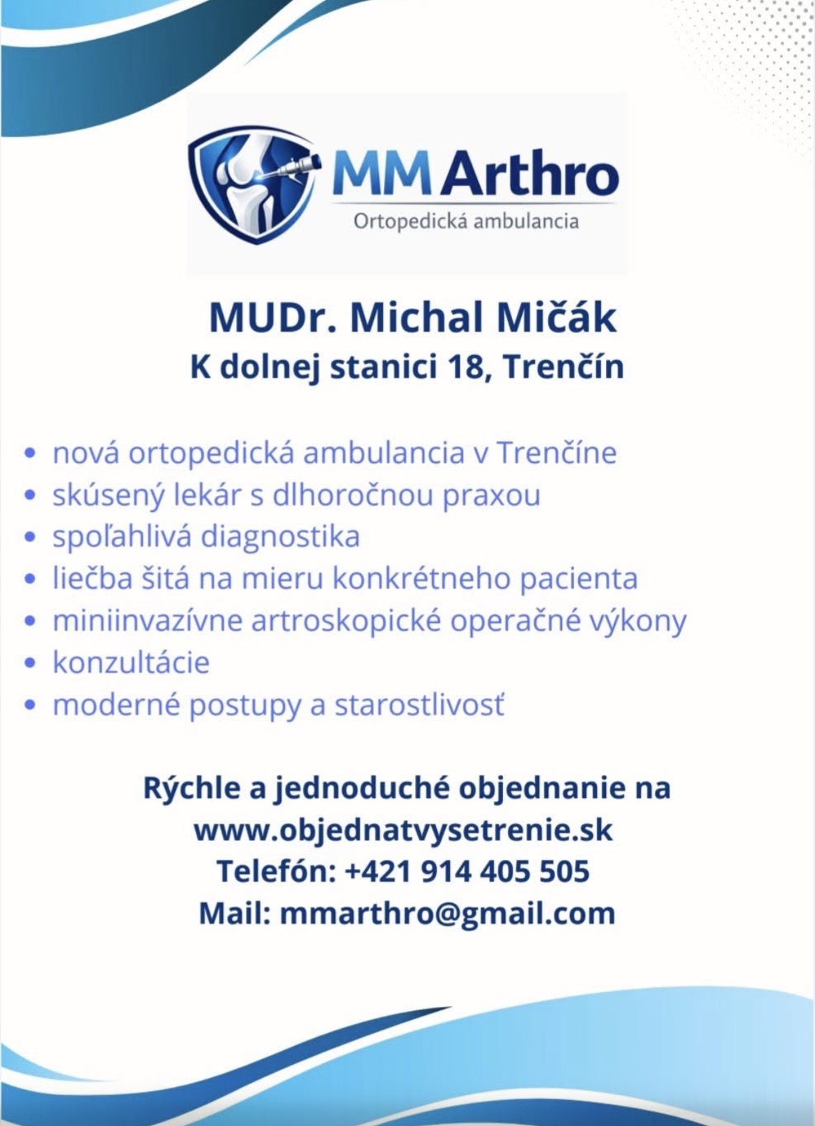 Od Apríla 2026 spustí prevádzku v priestoroch Polikliniky TN nová ortopedická ambulancia, ktorej prevádzkovateľom je spoločnosť MM Arthro s.r.o. Ambulancia je moderne vybavená - poskytuje konzultácie, spoľahlivú diagnostiku , miniinvazívne artroskopické operačné výkony, moderné postupy a komplexnú starostlivosť.